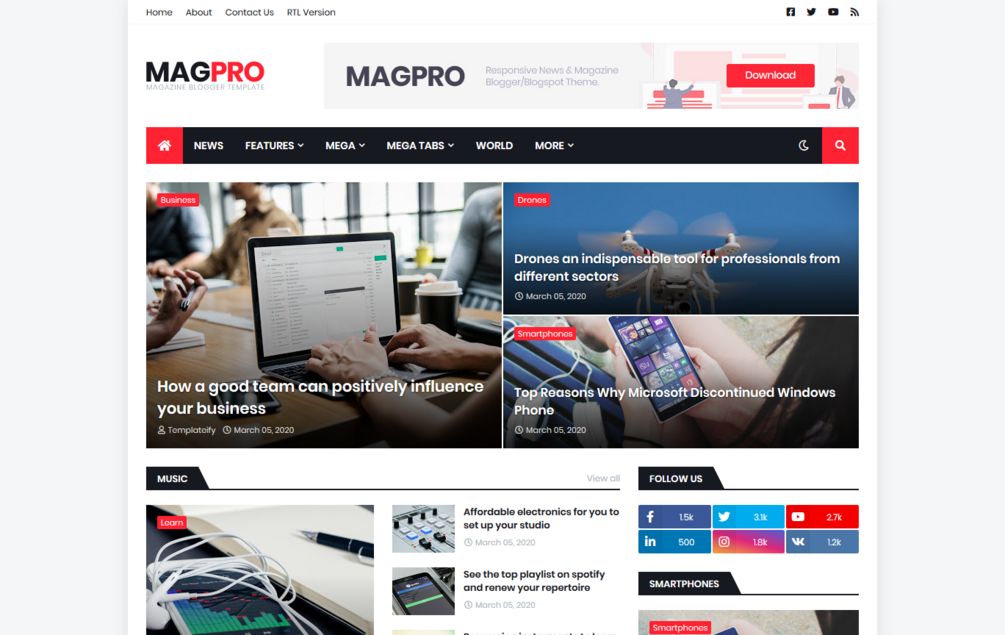 MagPro Responsive News & Magazine Blogger Templates is one of the most professional and modern blogger templates of 2020. It is fully customizable so that you can create several different websites with a single template. MagPro is optimized for search engines and mobile devices and is also super fast. MagPro is also AdSense friendly and has many sections to add your ads including In-Feed and In-Article types.