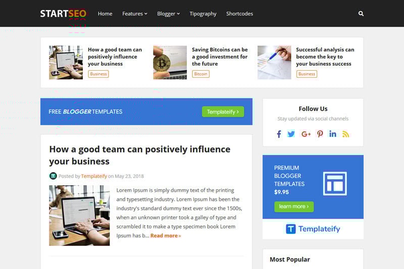 StartSeo is a powerful and professional blogger template, fully optimized for your blog to load as quickly possible. StartSeo also has strategic ad slots to boost your earnings. Also provided with a several custom gadgets and options for edit backgrounds, colors, widths and more.