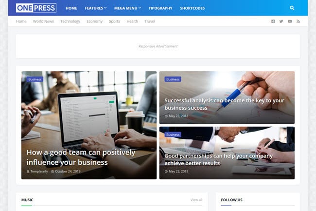 OnePress is a professional magazine blogger template. It is fully customizable, making it a unique option for you who want to create multiple sites with a totally different design with just one template. OnePress is very fast compared to any other magazine you find on the internet. Because we built it with the best and most advanced blogger template optimization techniques. It is also perfect for those who want to increase earnings as it has multiple ad sections, which is perfect for AdSense or other services ads.